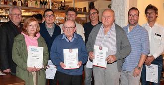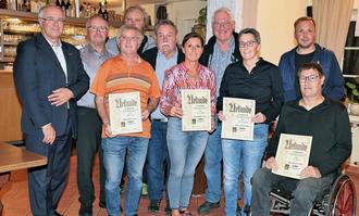 Ehrungen durch den Präsidenten des Skiverbandes Rheinland, Joachim Klein (v.l.): Joachim Klein, Alfred Esch, Josef Weber, Dieter Korden, Cornelia (Conni) Krämer, Gerd Solheid, Heike Kohsmann, Martin Gillessen, Uli Krämer, geehrt mit dem Ehrenbrief oder der Ehrennadel in Bronze, Brief: Korden, Gillessen, Solheid, Esch, Nadel: Weber, Conni u. Uli Krämer, Kohsmann