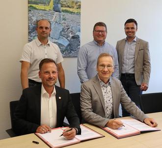 Vorne: Bürgermeister Björn Ingendahl, Stadt Remagen (l.), Bürgermeister Andreas Geron, Stadt Sinzig (r.) Hinten: Marc Göttlicher, Büroleiter Stadt Remagen (l.), Carsten Lohre, Werkleiter Stadtwerke Sinzig (m.), Christian Weidenbach, Büroleiter Stadt Sinzig (r.)