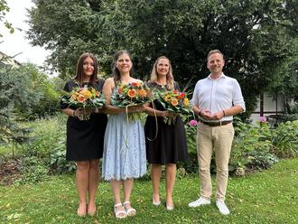 Das Geheimnis um die neue Remagener Weinkönigin 2024/2025 ist gelüftet: Weinkönigin Viktoria I. (2. v. l.) wird ein Jahr lang die Stadt Remagen repräsentieren. Begleitet wird sie von den Weinprinzessinnen Janina (r.) und Karolina (l.).