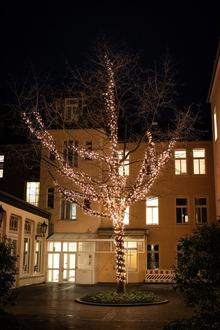 Der festlich illuminierte Baum im Rathaus-Innenhof