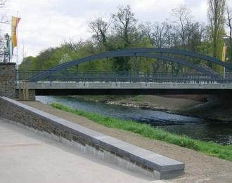 Die bei der Flut zerstörte, markante Stabbogenbrücke in der Landgrafenstraße am Tag ihrer Einweihung im Jahr 2008.