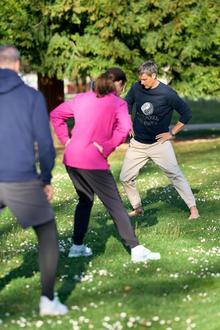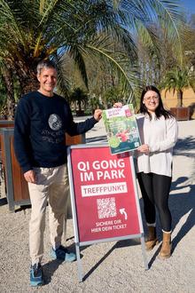 Trainer Dirk Alfter und Dania Münch, Referentin Gesundheitswirtschaft, präsentieren das neue Angebot Qi Gong im Kurpark.