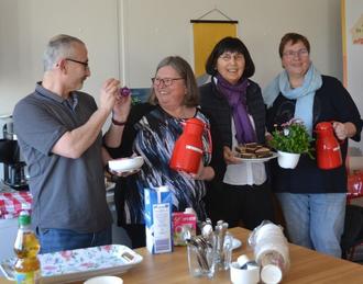 Mit Kaffee, Teilchen und Tischblumen, hier dargeboten von (v. r.) Mary Witsch und Hedi Klein, bot das Team des Projektes „Älterwerden in der Grafschaft“ den Tafelmitarbeitern einen wunderschönen Nachmittag, auf den (von links) Digitalbotschafter Thomas Titze und Birgit Schneider mit Ostereiern anstießen.