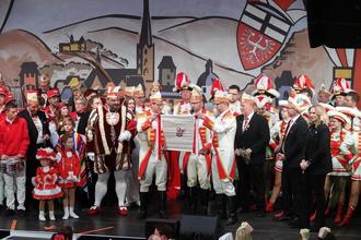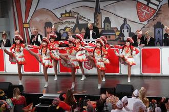 Die Integration der Proklamation in das Programm der Prunksitzung erwies sich für die Ahrweiler Narren als Volltreffer. Von der ersten Minute an konnte das Präsidium mit Carolin und Udo Groß den bunt kostümierten Narren einen Knaller nach dem anderen präsentieren. Die AKG-Familie füllte samt Spielmannszug traditionell zum Auftakt die Bühne bis auf den letzten Quadratzentimeter und machte dann artig Platz für den tanzenden Nachwuchs. Abschied nehmen hieß es für Prinzessin Ingrid (Derra) und ihre Adjutantin Dagmar (Platz). Da wurden schnell die letzten Orden verteilt, und zwar an die Nachfolger. Für Prinz Milan hieß es nach aufreibender Proklamation: Platz nehmen in einem angemessenen Thronsessel. Von hier aus konnte er sich die Tanzqualitäten seiner neuen Leibgarde anschauen, musste aber auch gleich ein paar „nette Worte“ der Ahrweiler Lästerschwestern Carolin Groß und Theresa Steffes über sich ergehen lassen. Die hatten Sponsoring durch einen örtlichen und weltweit agierenden Brausehersteller ausgemacht und rausbekommen, dass Milan dort einmal mit weißem Bart die Rolle des „Santa Claus“ übernehmen werde. Überhaupt war kaum jemand vor Ahrweiler bekanntestem Bütten-Duo sicher, egal ob Klangwelle, Aloisiusjugend oder die neue indische Küche in Ahrweiler, alle bekamen ihr Fett weg. Auch die Stadtzeitung als einzige Zeitung, die seit 35 Jahren von hinten nach vorne gelesen werde.