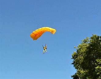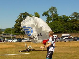 Hans-Werner Adams wies als Vertreter des Bürgermeisters in seinem Grußwort auf die Rudi Altig Gedenkstätte in unmittelbarer Nähe hin und überreichte einen Scheck der Stadt Sinzig. Es wurden weitere Spenden überreicht oder genannt, so von Baumaschinen Schneider, Ortsvorsteher Gunter Windheuser oder vom Lions Club Aschaffenburg. Eine Spende ging an die Janusz-Korczak-Schule für mehrere erlebnispädagogische Projekte. Dann richteten sich die Blicke gen Himmel: In rund 1000 Meter Höhe kreiste ein Flugzeug, und plötzlich waren zwei Punkte zu sehen, die sich schnell näherten und sich als Fallschirme entpuppten. Punktgenau landeten Klaus Renz und Eberhard Gienger auf der Jahnwiese. Renz hat bereits mehr als 7.700 Sprünge hinter sich und ist neben vielen Titeln auch Weltmeister. Und Eberhard Gienger, inzwischen auch schon knapp Ü 70, ist sicher vielen noch als ehemaliger Reckweltmeister bekannt.
