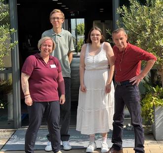 Johanna Gies (2.v.r.) und Florian Klammer (2.v.li.) mit Projekt-Leiter Walter Korb (r.) und Jana Seifert, Leiterin Housekeeping (li.)