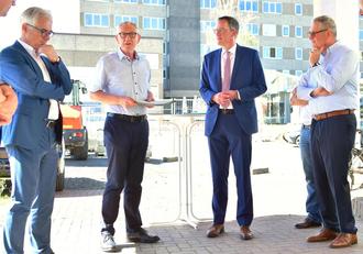 Überreichung der Förderbescheide: Hermann Josef Pelgrim (Geschäftsführer der Aufbau- und Entwicklungsgesellschaft), Bürgermeister Guido Orthen, Innenminister Michael Ebling und Erster Beigeordneter Peter Diewald (v.l.)