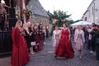BACHEM. TW. FestiWein - so nannte Bachem in diesem Jahr sein Weinfest, dass am vergangenen Wochenende viele Menschen in den kleinen Weinort südlich der Ahr lockte. Dort hatte Lena Knieps drei Jahre lang die Krone der Bachemer Weinkönigin getragen, ehe sie diese am Freitagabend an ihre Nachfolgerin übergeben durfte. Erst Corona, dann die Flutkatastrophe hatten die Amtszeit der Regentinnen unfreiwillig verdreifacht. Wer neue Weinkönigin sein würde, blieb bis kurz vor der Proklamation ein Geheimnis, dass nur der Arbeitskreis um die Vorsitzende Melanie Giffels kannte. Erst als sich die Weinköniginnen des Ahrtals mit Wunderkerzen in der Hand zum Spalier formierten, wurde das Geheimnis gelüftet: Merle Kurth heißt die neue Regentin Bachems. Der 22-jährigen Weinwirtschafts-Studentin stehen zwei Prinzessinnen zur Seite, nämlich die gleichaltrige Sarah Schumacher und die ein Jahr jüngere Julia Gansewig. Alle drei nennen bei der Frage nach ihrem Lieblingswein den Bachemer Frühburgunder. Mit der Übergabe der Krone und der Proklamation hieß es am Freitagabend auf der Bühne für Lena Knieps und ihre Prinzessinnen Janina Rosello-Tormo und Christina Ismar Abschied vom Ehrenamt der Weinkönigin zu nehmen. Erste Gratulanten der neuen Regentinnen waren vor zahlreichen Gästen am Bachemer Backes Kreisstadt-Bürgermeister Guido Orthen und Bachems Ortsvorsteher Uli Stieber.