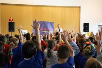 Umso größer die Freude bei 200 Vorschülerinnen und Vorschülern, dass der schöne musikalische Brauch nun in diesem Jahr wiederbelebt werden konnte. Um kurz vor 11 Uhr trudelten die Kinder aus dem gesamten Stadtgebiet in ihren bunten Kita-Gruppen-Shirts in die Halle ein und setzten sich im großen Halbkreis um die Bühne, auf der sich Musiker Johannes Kleist mit seiner Gitarre bereits häuslich eingerichtet hatte.