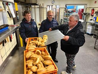 Die Bäckerei Brand in Bad Neuenahr "beschützte" die Kameraden der örtlichen Feuerwehr vor hungrigen Mägen und lieferte im Rahmen der Kirmes Brötchen an die Floriansjünger. In freudiger Erwartung auf ein leckeres Frühstück zum Aufbau des Kirmes-Zeltes schauen Sascha Radermacher und Thomas Vollmer auf die leckeren Brötchen von Bäckermeister Ulrich Brand.