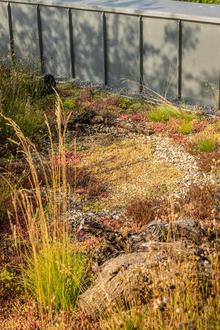 Um die Entwicklung der Artenvielfalt zu gewährleisten wurden auf dem Biodiversitätsdach verschiedene Bereiche angelegt. Die Ansaat mit regionalen Wildpflanzen erstreckt sich über die gesamt Grünfläche und bietet allen tierischen Bewohnern eine gute Futterquelle.