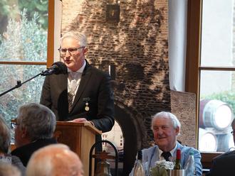 Sie sind gesellige Beisammensein und informative Treffen, die Hutenfeste der Ahrweiler Innenstadtquartiere. Dabei berichten Vertreter des öffentlichen Lebens aus ihren Bereichen. Bei der Oberhut bedankte sich Bürgerschützenkönig Dieter Zimmermann für die Unterstützung beim Historischen Trinkzug, was Hutenmeister Heiner Fuhs lächeln lässt.