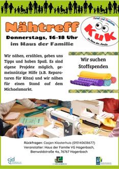 Wir nähen, erzählen, geben uns Tipps und haben Spaß. Es sind eigene Projekte möglich, gemeinnützige Hilfe (z. B. Reparaturen für Kitas) und wir nähen für einen Stand auf dem Michaelsmarkt. Wir freuen uns über Stoffspenden. Jeden Donnerstag, 16:00 Uhr – 18:00 Uhr im Haus der Familie.