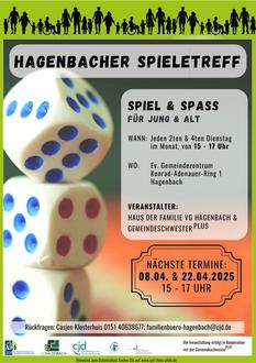 Wir spielen verschiedene Spiele, gerne auch Klassiker, in gemütlicher Runde bei Kaffee und Keksen. Jeden zweiten und vierten Dienstag im Monat, 15:00 Uhr – 17:00 Uhr im ev. Gemeindezentrum, Konrad-Adenauer-Ring 45, Hagenbach. Nächste Termine: 08.04.2025, 22.04.2025.