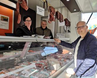 Stadtbürgermeister Christian Hutter beim Einkauf am Wildstand von Familie Rück.