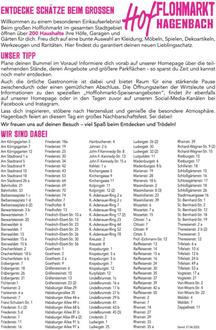 Ab dem Wochenende werden die Flyer und Plakate für den Hofflohmarkt verteilt. Wer noch mehr Werbematerial benötigt oder den Hofflohmarkt unterstützen möchte, auch ohne teilzunehmen, darf sich gerne ab Sonntag neben der Rathaustreppe Werbematerial wegnehmen. Bitte verteilt das Material in der Region und schmückt eure Höfe und Garagen mit den Plakaten.