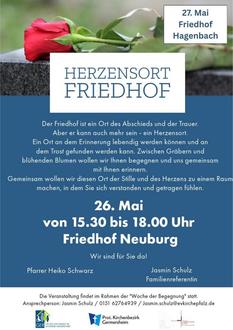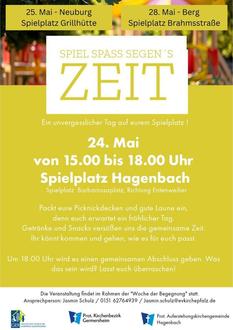 Jasmin von der evangelischen Kirche veranstaltet Spielplatztreffen in Hagenbach (Fleckensteinweg), Neuburg (Grillhütte) und Berg (Brahmsstraße). Es wird außerdem wieder eine Trauerbank an den Friedhöfen in Hagenbach und Neuburg geben. Hier wird zum Gespräch über die Trauer, den Tod und das Leben mit Jasmin Schulz oder Heiko Schwarz eingeladen.
