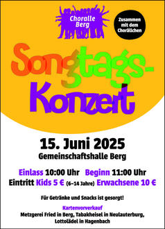 Am Sonntag, den 15. Juni 2025, laden wir herzlich zu unserem „Songtags-Konzert“ in die Berger Gemeinschaftshalle ein. Einlass ist ab 10:00 Uhr – stimmen Sie sich gerne bei Snacks und Getränken schon ein, bevor wir dann um 11:00 Uhr mit unserem Konzert beginnen.