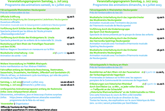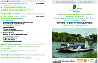 Der PAMINA-Rheinpark / Parc Rhénan e.V., ein Zusammenschluss von 31 Kommunen und Gebietskörperschaften zwischen Strasbourg und Germersheim versucht seit fast 25 Jahren, die Menschen links und rechts des Rheins auf verschiedenen Ebenen zusammenzuführen, damit sie ihre gemeinsame Geschichte sowie Kultur kennenlernen und grenzenlos miteinander feiern können. Gelegenheit hierzu gibt es am „Wochenende der Begegnung und Mobilität am Rhein“. Am 1. und 2. Juli steht der Rheinübergang Neuburg – Rheinstetten/Neuburgweier im Mittelpunkt der Veranstaltung. Ein buntes Programm für Kinder und Erwachsene wird an diesem Wochenende angeboten, u.a. verschiedene Vorführungen, Bootsübungen auf dem Rhein mit den Freiwilligen Feuerwehren und dem DLRG, Erläuterungen zum historischen Rheinverlauf, Infostände, kostenlose Besichtigung der Museen, Bewirtung, etc. Gefördert wird diese Veranstaltung durch das Förderprogramm „Nouveaux Horizons“ von der Baden-Württemberg Stiftung. Die zweisprachige Broschüre kann auf der Internetseite www.pamina-rheinpark.org heruntergeladen oder auf Anfrage per Post zugesandt werden. Mehr Infos zum Veranstaltungsprogramm:
