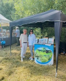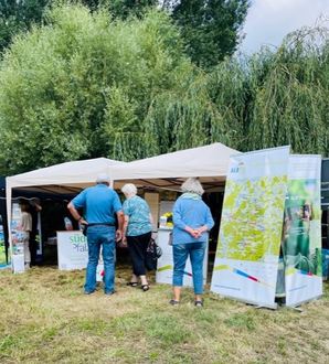 Marie-Renée Sitter vom Pamina-Rheinpark und Bürgermeisterin Iris Fleisch an Infostrand der Tourismusvereine