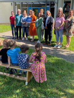 An diesem besonderen Tag hatte sich Besuch angekündigt: Bildungsministerin Frau Dr. Stefanie Hubig war aus Mainz angereist, um anzuerkennen, dass sich die Kita seit vielen Jahren durch Spracharbeit, Partnerschaft mit der Ecole Maternelle und gemeinsamen Aktionen um das deutsch-französische Zusammenleben verdient gemacht hat.