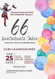 Der CVB feiert dieses Jahr sein 6x11 Jahre-Jubiläum. Eigens zu diesem besonderen Anlass findet am Samstag, dem 25. Januar 2025 eine bunte Jubiläums-Soiree mit Festakt und kleinem Programm sowie Tanzmusik statt, zu der wir alle Bürgerinnen und Bürger, Freunde und Gönner herzlich einladen. Der Eintritt ist frei. Veranstaltungsort: Gemeinschaftshalle Berg. Wir freuen uns sehr auf einen schönen Abend mit Euch.