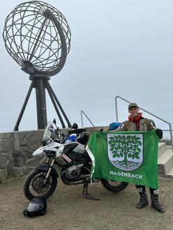 Robin Scherrer fuhr mit seinem Motorrad und der Hainbuchenfahne von Hagenbach bis hoch ans Nordkap.