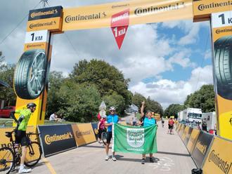 Die Radsportfans Elli und Hans Diener mit dem Stück Heimat unter dem Teufelslappen (letzter Km vor dem Ziel) bei der Tour de France in den Vogesen.