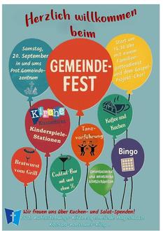 14:30 Uhr - Herzlich Willkommen zum Gemeindefest. Wir starten um 14:30 Uhr mit einem Familiengottesdienst und dem Gospel-Projekt-Chor. Danach freuen Sie sich auf Kinderspiele-Stationen mit der Kirche Kunterbunt, Tanzvorführungen und Bingo. Für das leibliche Wohl ist bestens gesorgt: Kaffee und Kuchen, Bratwurst vom Grill, Salatbuffet, orientalischen und asiatischen Köstlichkeiten von den Frauen des Deutschkurses und Cocktail-Bar.