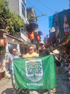 Andy Betsch, Simon Belka und Roland Hecht sind am vergangenen Wochenende in die Hauptstadt Vietnams nach Hanoi gereist. Auf der berühmten Trainstreet, wo zwei Mal täglich ein Zug mitten durch die enge Gasse eines Wohn- und Kneipenviertels fährt, präsentierten sie die Hagenbacher Hainbuchenfahne.