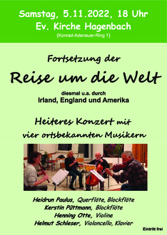 Nach dem großartigen Erfolg im vergangen Jahr, planen dieselben vier ortsbekannten Musiker, Heidrun Paulus, Kerstin Püttmann, Henning Otte und Helmut Schleser, eine Fortsetzung ihrer musikalischen Reise um die Welt. Am Samstag, dem 5. November 2022 in der Ev. Kirche Hagenbach, K.-A.-Ring 1 und am Sonntag, dem 6. November 2022 in der Gemeinschaftshalle Berg, Waldstraße, soll sie jeweils um 18:00 Uhr starten. Diesmal führt die Reise u.a. nach Irland, England, Italien und Österreich, aber natürlich wird es auch wieder die eine oder andere Stippvisite in Amerika geben. Auch Musik aus Deutschland wird erklingen. Man kann also sehr gespannt sein, was das Quartett diesmal auf die Beine stellen wird. Reiseroute: England - USA - Deutschland - Irland - Österreich - Italien.
