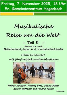 Die musikalische Reise um die Welt“ Teil 5 - kreuz und quer geht es dieses Mal nach Griechenland, Japan und in den Orient. Der Eintritt ist frei - über Spenden freuen wir uns sehr. Bewirtung in der Pause.