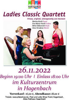 Spontane Kulturfreunde aufgepasst: Karten für das Konzert mit dem Ladies-Classic-Quartett am Samstag, dem 26. November 2022, um 19:00 Uhr im Kulturzentrum sind noch an der Abendkasse erhältlich. Einlass ist um 18:00 Uhr. Zum Verzehr bieten wir leckere Weine und eine Variation an Häppchen. Wir freuen uns auf einen zauberhaften Abend mit klassischer Musik.