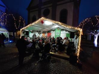 Die Südpfalz Musikanten bereicherten unseren Weihnachtsmarkt mit festlichen Klängen. Knapp 30 Musiker aus Neuburg, Berg und Hagenbach musizierten trotz klirrender Kälte.