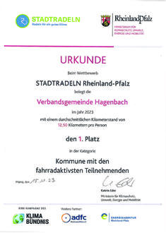 In einem Gratulationsschreiben gratulierte Ministerin Katrin Eder der Verbandsgemeinde zum 1. Platz in der Kategorie „Kommune mit den fahrradaktivsten Teilnehmenden (km-pro-Einwohner*in-Durchschnitt)“ beim Stadtradeln Rheinland-Pfalz im Jahr 2023 mit einem durchschnittlichen Kilometerstand von 12,5 Kilometern pro Person.