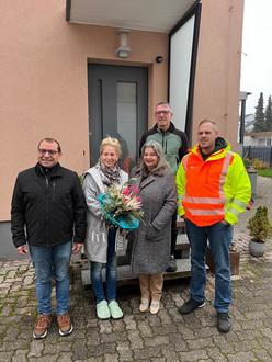 C. H. Laukeninks (Bauleiter Verne), Kundin K. Stephany, S. Gerhart (Ortsbürgermeisterin), M. Liepus (Bauleiter D.Glasfaser), hi. re.: Kunde M. Stephany. Foto wurde im November 2024 aufgenommen.
