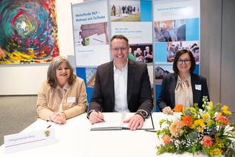 Bürgermeisterin Iris Fleisch und Ortsbürgermeisterin Sabine Gerhart bei der Unterzeichnung der Kooperationsvereinbarung mit Sozialminister Alexander Schweitzer in Mainz