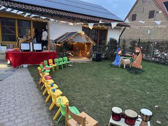 Auch in diesem Jahr durften die Figuren wieder in die Krippe „einziehen“. Um diesen Moment würdig zu begleiten, bereiteten die Erzieherinnen eine warme und einladende Atmosphäre im Garten vor. Mit Lichterketten, Stehtischen und vielen kleinen Details entstand ein gemütlicher Rahmen für den gemeinsamen Jahresabschluss. Ein kleiner Stand mit Punsch, Glühwein, Brötchen, Knabbereien und frischem Obst sorgte zusätzlich für das leibliche Wohl der Eltern.