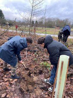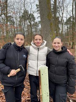 Um einen eigenen Beitrag für die Aufforstung des Waldes zu leisten, machten sich die Schülerinnen und Schüler im Anschluss entlang des Holzwegs an die Arbeit und setzten in Dreiergruppen zahlreiche Bäume. Voller Stolz erhielten einige Bäume Namen und wurden ausgiebig fotografiert.