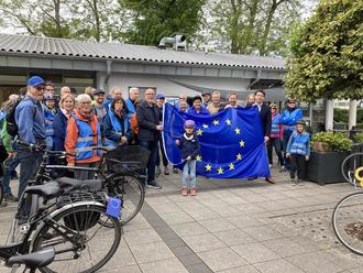 Die Begrüßung erfolgte durch Bürgermeister Volker Poß und Thomas Hitschler, Mitglied des Deutschen Bundestages und Parlamentarischer Staatssekretär im Verteidigungsministerium. Beide betonten in ihrer Ansprache, wie wichtig es sei, für ein geeintes Europa einzustehen und freuten sich über das große Engagement der Radfahrenden, die diesen Gedanken nach außen tragen.