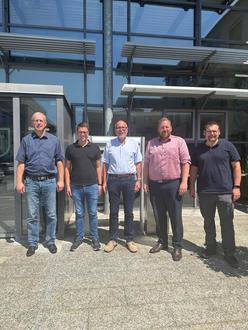 Das Bild zeigt von links nach rechts: Jörg Teusch (Dozent); Kai Scherrer, Bürgermeister Volker Poss, Mike Schönlaub, Jens Thiele (Dozent)
