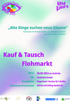 Im Rahmen der diesjährigen Interkulturellen Woche findet am Donnerstag, den 28. September 2023 von 16 Uhr bis ca. 18 Uhr in der Stadthalle Kandel ein Flohmarkt statt, bei den alle Interessierten verkaufen, tauschen oder aber nur stöbern können.