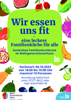 Wir essen uns fit – eine leckere Familienküche für alle: Kostenlose Familienkochkursreihe im MGH. Kochstart: 04.10.2023 (Gut Essen mit der Ernährungspyramide) von 16:00 bis 19:00 Uhr. Maximal 10 Personen. Anmeldung unter 07271-8622 oder mgh-woerth@ib.de. Folge Termine im Oktober: 11.10.23 (Sauber arbeiten und sicher schneiden), 25.10.23 (Beste Reste – lecker verwertet).