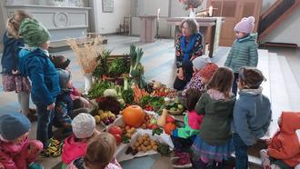 Es ist eine gute Tradition in der Kirchengemeinde, dass das Kita-Team Storchenbrunnen mit den Kindern in die Kirche kommen und die Erntegaben bestaunen. Vorne im Altarraum leuchteten ihnen die Früchte und Gemüse entgegen, schmackhaft und einladend. Manche erkannten sie und manche lernten sie kennen. Wissbegierig waren die Kinder und interessiert an der Vielfalt. Ich erklärte ihnen, dass die Ernte groß ist und wir Gott danken. Mit Freude sangen sie ihr Lied vom Ernten und machten dazu ihre Bewegungen. Danach gab es noch eine Runde Erzählen, wie sie im Garten schon geholfen haben. „Ich habe mit Mama Himbeeren gepflückt“ erzählt ein Mädchen. Von einem Jungen erfuhren wir: „Ich habe mit Papa ein Loch gegraben um zu pflanzen“. Und weil einer vom Apfelernten erzählte, sangen sie das Lied vom Apfelernten noch einmal. Zum Schluss durften sie Früchte, Gemüse und den guten Salat mitnehmen um zu schmecken, was gewachsen ist, was Gott uns schenkt. Ganz vorsichtig trug jedes Kind eine Gabe, wie einen Schatz, wissend, dass Essen kostbar ist.