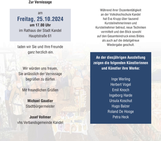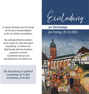Wir möchten außerdem zu einer Vernissage und Ausstellung anlässlich des 50-jährigen Dozenten-Jubiläums von Frau Eva Krupp einladen, die während des Kandeler Herbstmarktes im Rathaus stattfindet.