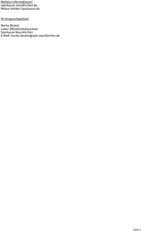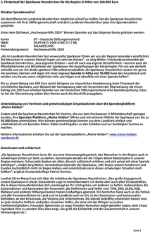 „Als im Landkreis Neunkirchen fest verwurzelte Sparkasse fühlen wir uns der Region besonders verpflichtet. Die Menschen in unserer Heimat liegen uns sehr am Herzen“, so Jörg Welter, Vorstandsvorsitzender der Sparkasse Neunkirchen. „Aus eigenem Erleben - und oft auch aus eigener Betroffenheit - kennen auch die Mitarbeiterinnen und Mitarbeiter der Sparkassen die Auswirkungen der Katastrophe. Für uns war deshalb schnelle und vor Ort direkt spürbare Hilfe selbstverständlich. Als Sparkasse Neunkirchen setzen wir gerne ein positives Zeichen und legen mit einer eigenen Spende in Höhe von 50.000 Euro den Grundstock und würden uns freuen, wenn möglichste viele uns folgen und ebenfalls mit einer Spende helfen“. Bis zu einem Betrag von 300 Euro reicht übrigens zur steuerlichen Anerkennung beim Finanzamt der vereinfachte Nachweis, zum Beispiel der Kontoauszug oder ein Screenshot der Überweisung. Ab einem Betrag von 300 Euro erhalten Spender von der Deutschen Stiftungstreuhand eine Spendenquittung. Dazu ist bei der Überweisung neben dem Namen auch die Anschrift anzugeben, Unterstützung von Vereinen und gemeinnützigen Organisationen über die Spendenplattform „Meine Helden“ Zudem wird die Sparkasse Neunkirchen für Vereine, die von dem Hochwasser in Mitleidenschaft gezogen wurden, ihre Spenden-Plattform „Meine Helden“ öffnen und mit weiteren Mitteln der Sparkasse von bis zu 50.000 Euro unterstützen. Hier können gemeinnützige Vereine aus dem Landkreis einfach und unbürokratisch um Spenden bitten. Dabei sind Angaben zu den Schäden und zur benötigten Summe zu machen. Weitere Informationen erhalten Sie auf der Spendenplattform „Meine Helden“: www.meine-helden- sparkasse.de