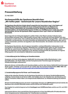 Die Sparkasse Neunkirchen leistet aktuell angesichts der besonderen Lage in der Region auf vielfältige Weise Hochwasserhilfe mit einem umfangreichen Bündel von Maßnahmen. Dieses umfasst insbesondere die Unterstützung bei der Meldung und Abwicklung von Unwetterschäden, ein Sonderkreditprogramm in Höhe von 10 Millionen Euro sowie eine große Spendenaktion, bei der die Sparkasse selbst insgesamt einen Topf in Höhe von 100.000 Euro bereitstellt.
