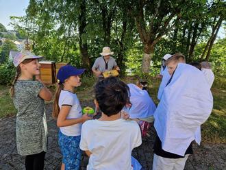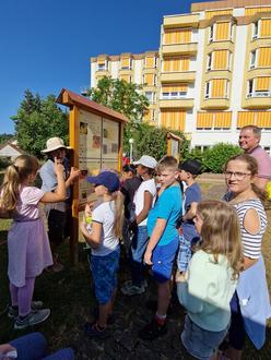 Am Freitag, 7. Juli, ging unser Bienenprojekt des Obst- und Gartenbauvereins und des Bienenzuchtvereins in den beiden dritten Klassen in die nächste Runde. Heute spazierten wir zum AWO Seniorenheim, denn dort warteten bereits drei Mitmachstationen auf uns. Nachdem wir gefrühstückt hatten, begrüßte uns Herr Nehren und erklärte uns die Stationen. Wir lernten an diesem Vormittag viel über die Bienen, wir schauten geschützt durch Imkeranzüge in die Bienenstöcke, versuchten Bienen mit der Becherlupe einzufangen und konnten sie so besser beobachten. An einer weiteren Station betätigten wir uns kreativ, wir stellen Buttons mit Bienenmotiven her und bastelten. Das Highlight des Vormittags war jedoch das Honigschleudern. Jedes Kind durfte an der Honigschleuder helfen und natürlich auch von dem leckeren Honig probieren. Gestärkt durch leckere Kaffeestückchen fuhren wir wieder zurück zur Schule. Vielen lieben Dank an alle Mitwirkende des OGV Ziegelhütte und des Bienenzuchtvereins für diesen schönen Vormittag.