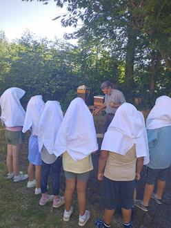 Dort waren bereits drei abwechslungsreiche Mitmachstationen vorbereitet. Nach einem gemeinsamen Frühstück begrüßte Herr Nehren die Kinder und stellte die Stationen vor. Ausgestattet mit Imkeranzügen warfen die Kinder einen Blick in echte Bienenstöcke, beobachteten Bienen mit Becherlupen und erfuhren viel Wissenswertes über das Leben der Honigbiene.