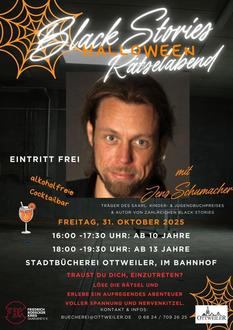 Am Freitag, dem 31.10., lädt Jens Schumacher zu einem interaktiven Rätselabend rund um seine BLACK STORIES in die Stadtbücherei Ottweiler im Bahnhof ein.